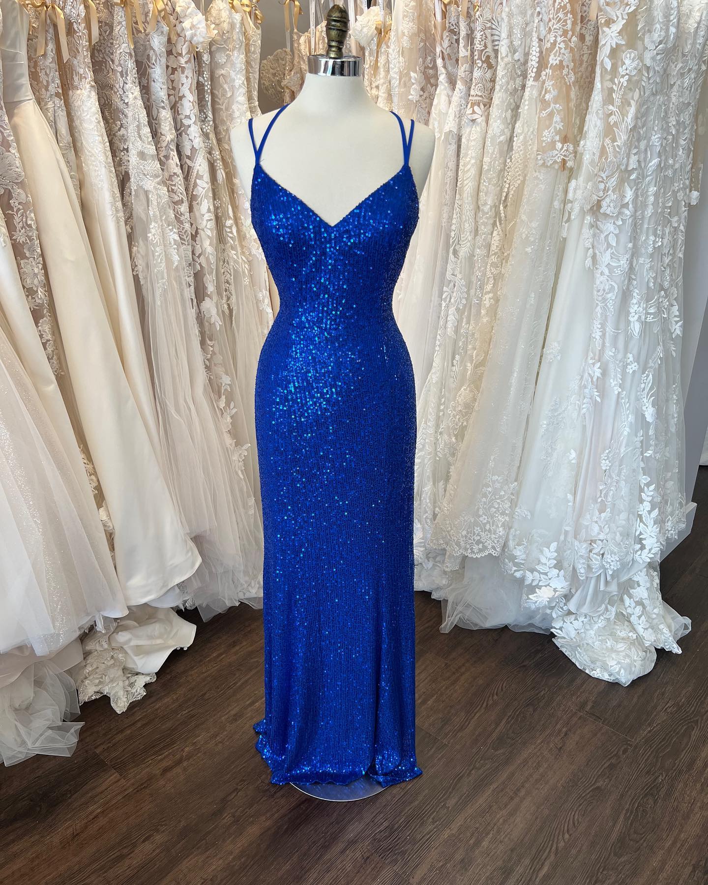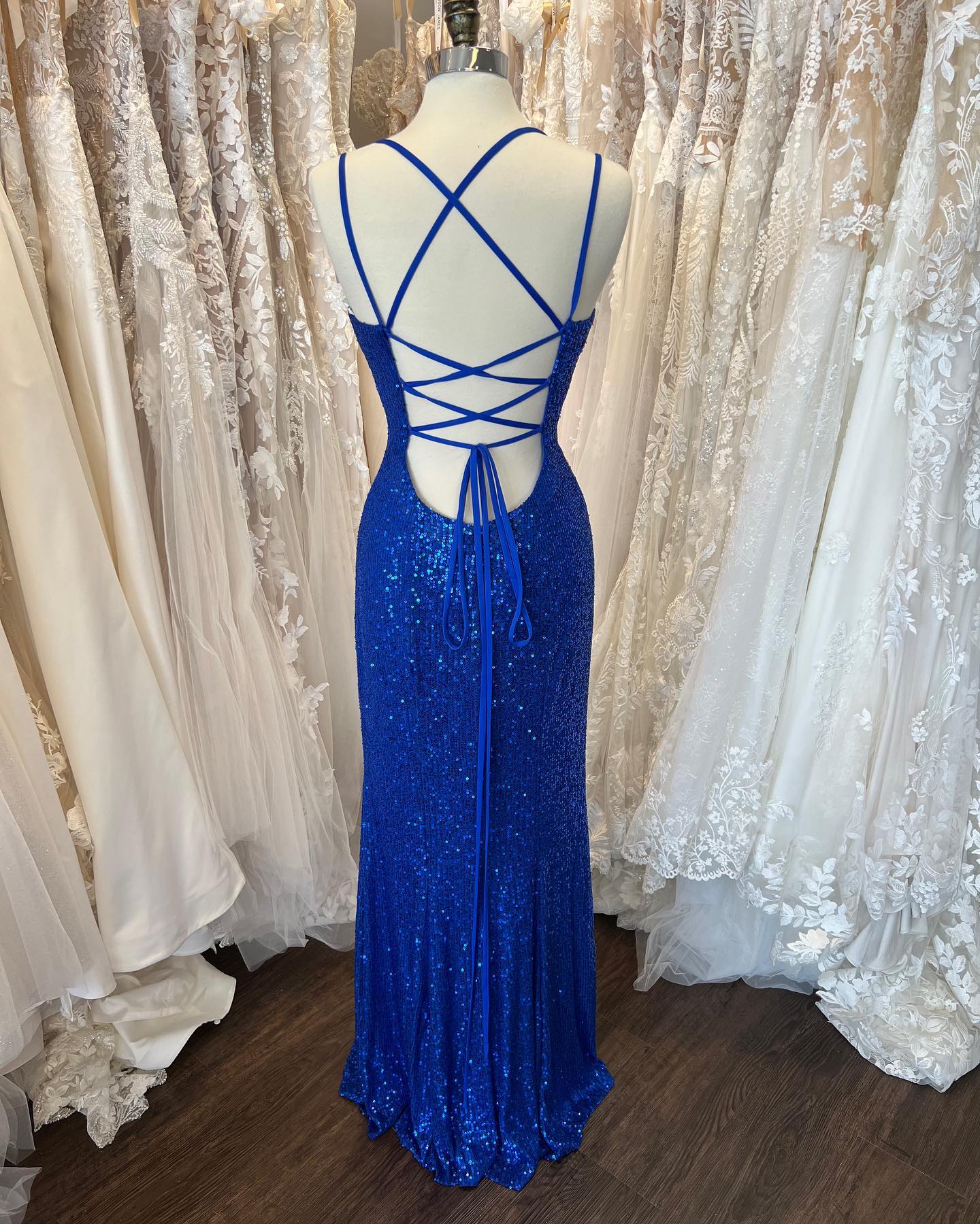 Simply royal blue mermaid long prom dress features spaghetti straps, v neck and lace up back.