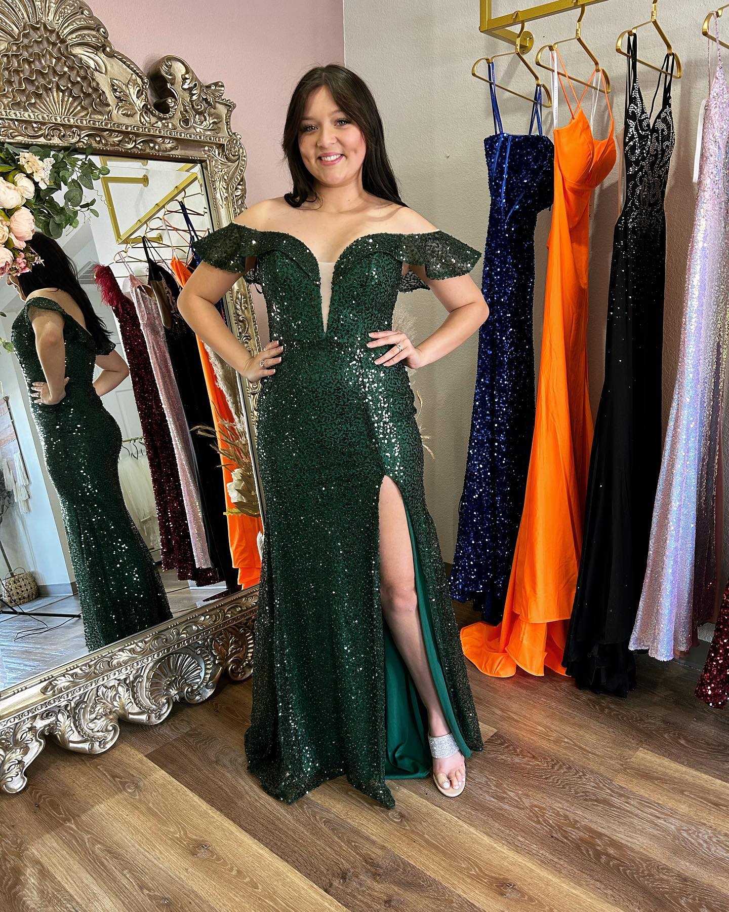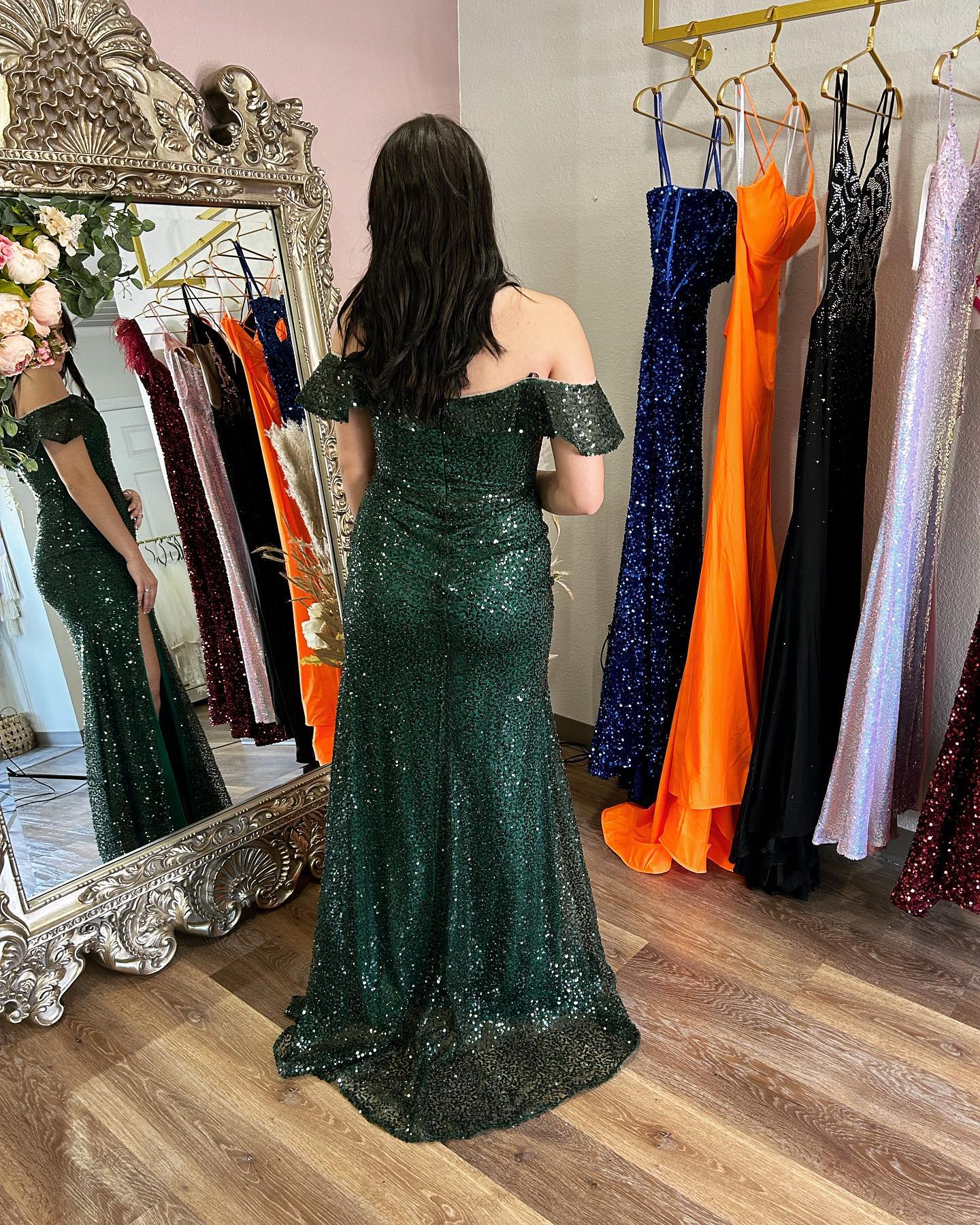 Dark green sequin mermaid long prom dress features off the shoulder and zip up back.