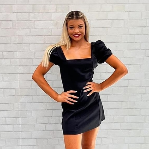 This black homecoming dress features puff sleeves, and a sheath silhouette.