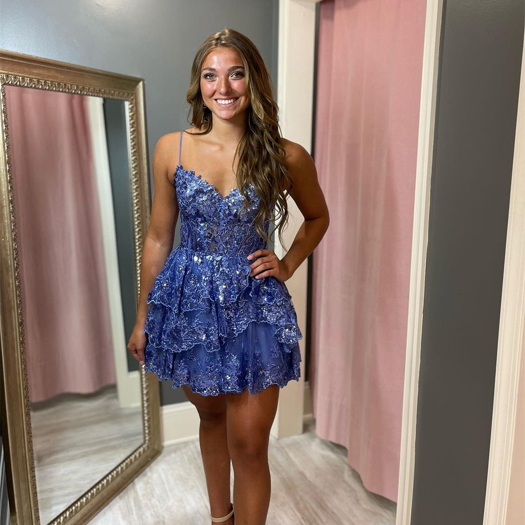 This style of homecoming dress features a V neckline on the front and back with spaghetti straps, a sheer corset bodice with sequined detail, and a short-length skirt with multi-layers.