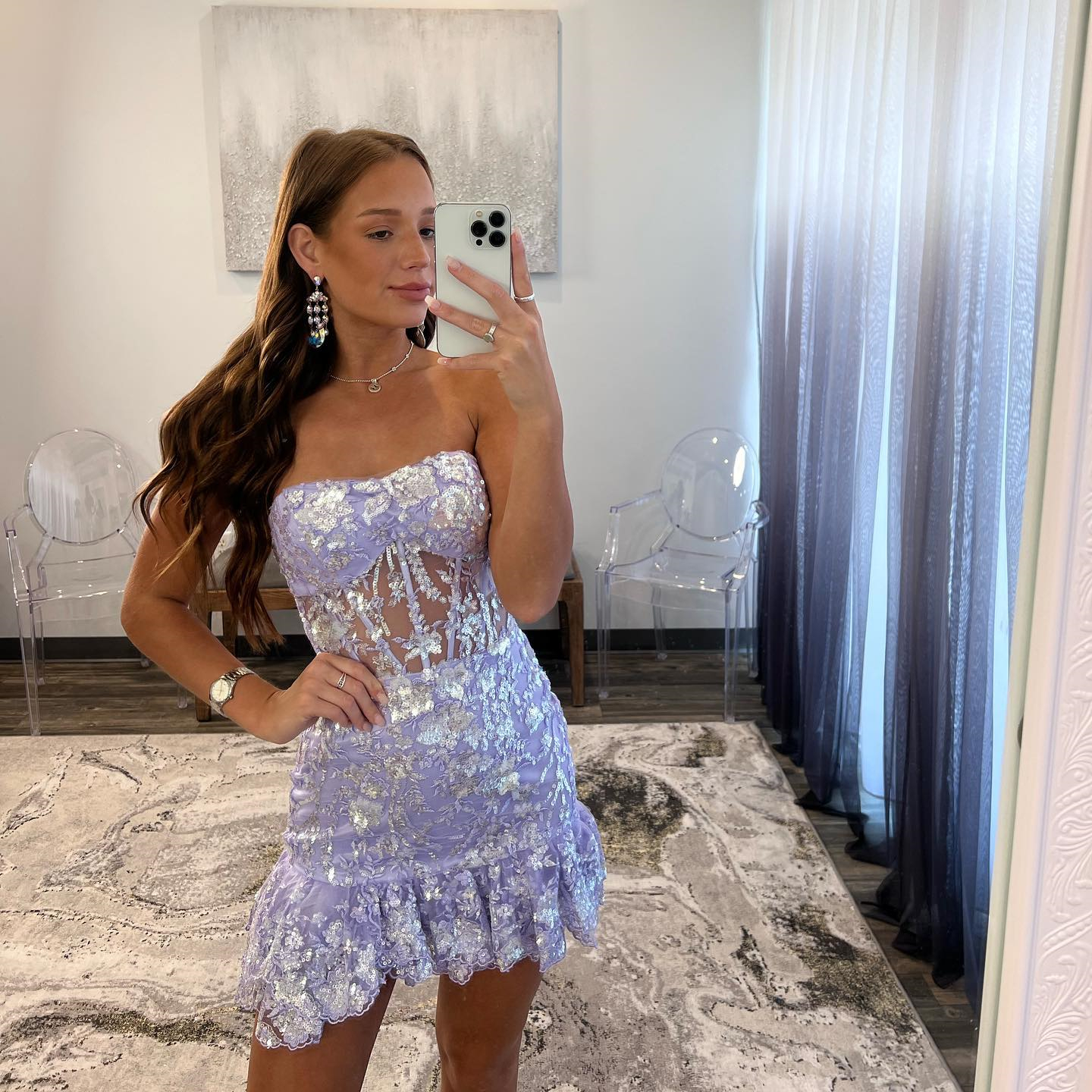 This lavender homecoming dress features a strapless neckline, a sheer corset bodice with structured boning inside, a sheath silhouette full of sequined-embroideries, and a ruffled design at the hemline.