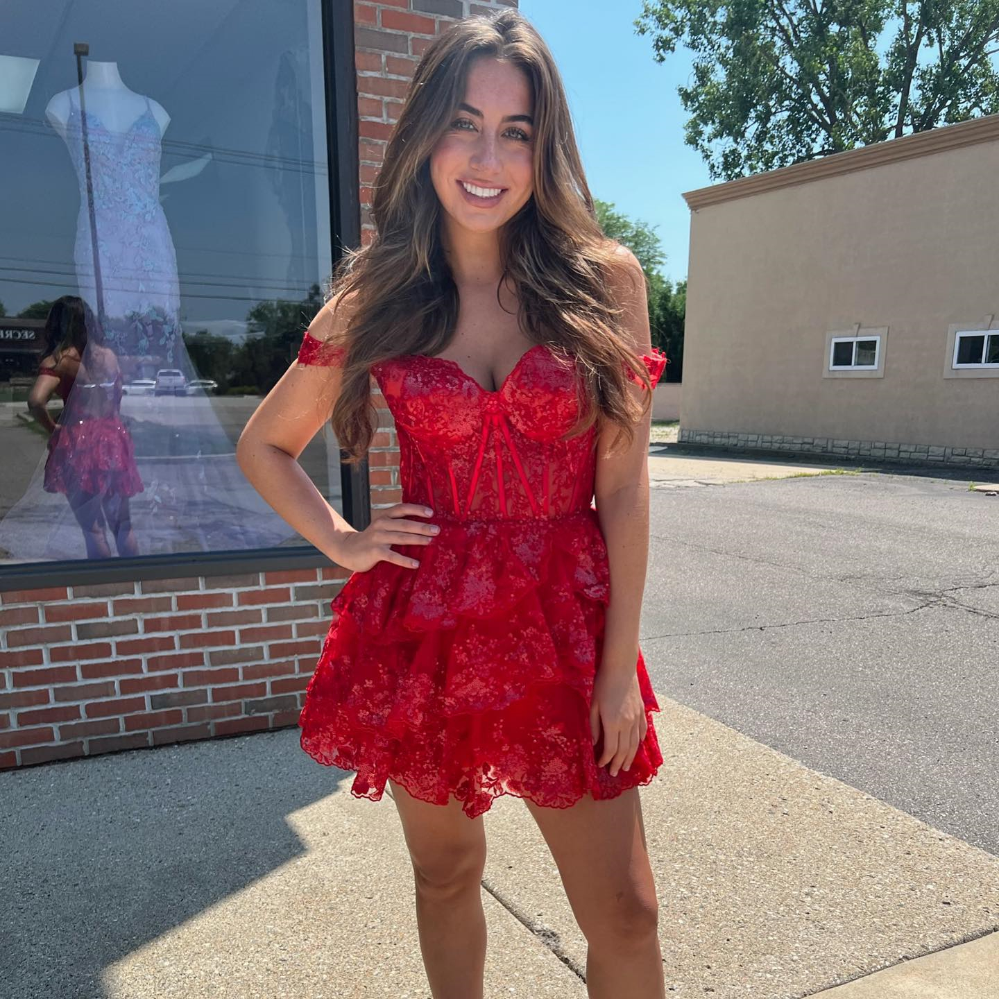 This style of homecoming dress features an off-the-shoulder neckline, a sheer corset bodice with structured boning inside, an A-line silhouette full of sequined detail, and a short-length skirt with multi-layers.