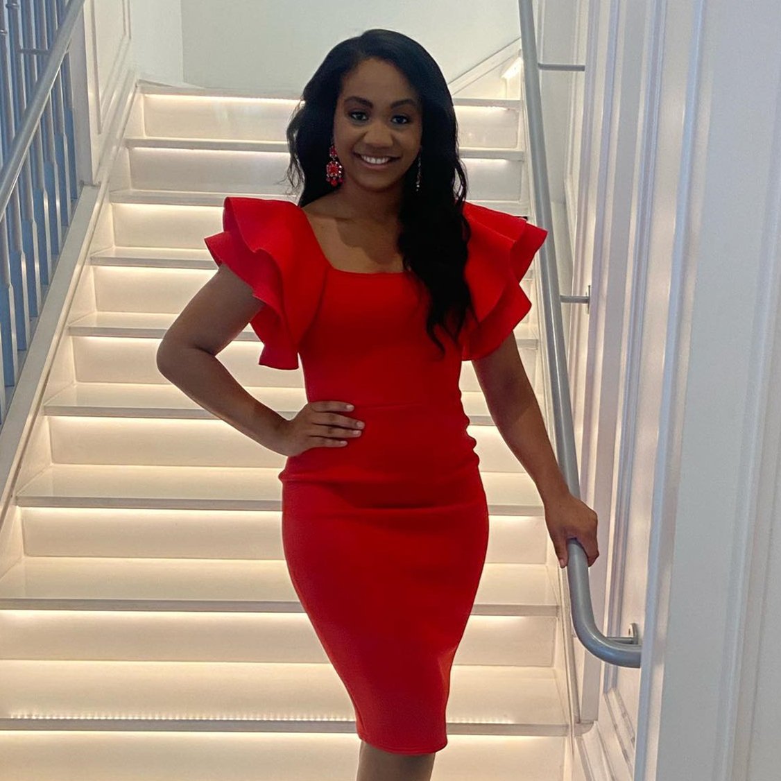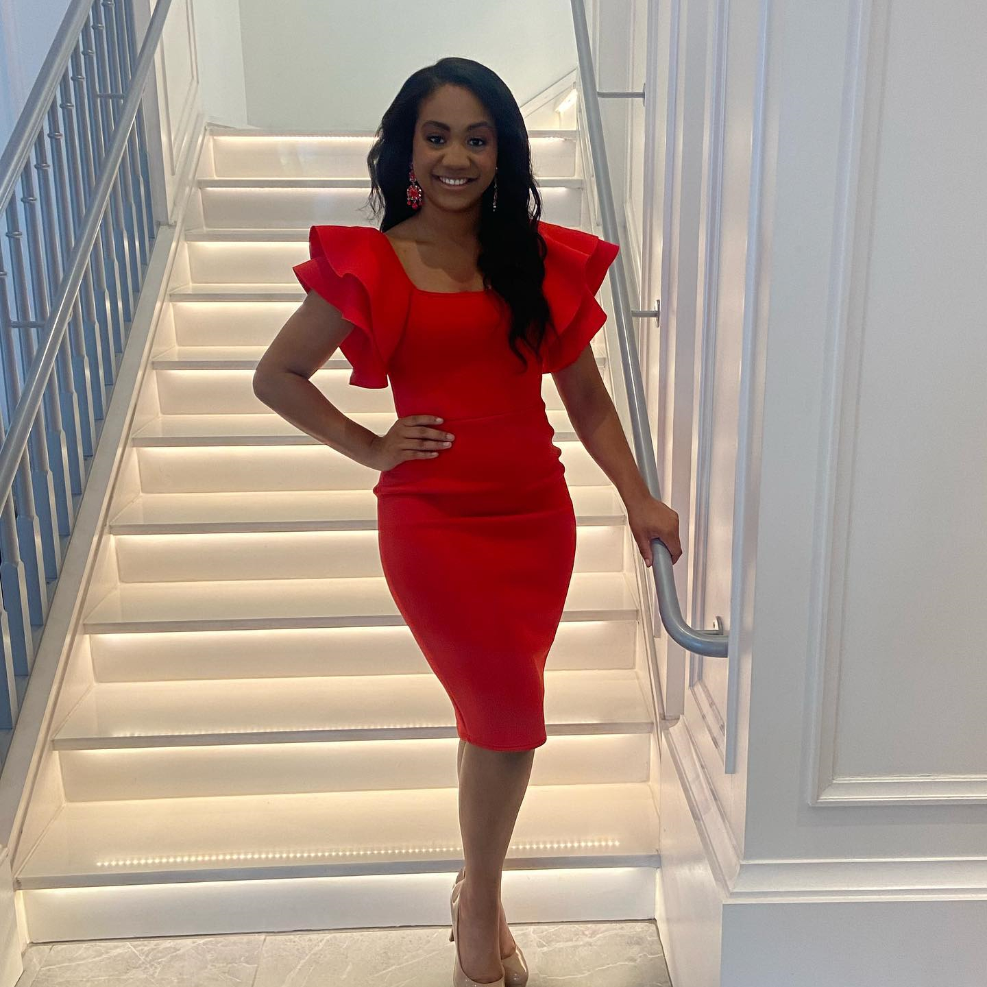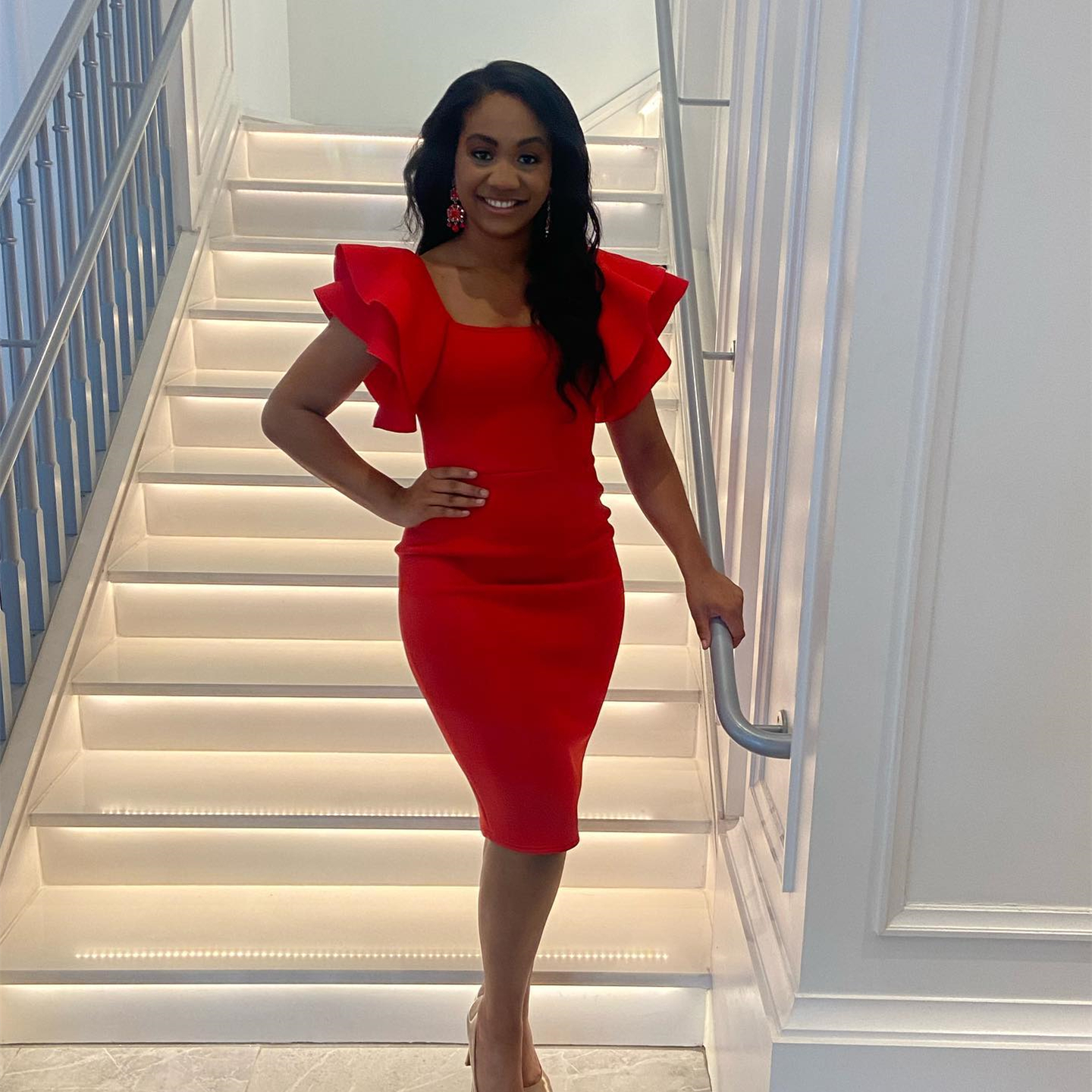 This red homecoming dress features a square neckline with layered short sleeves, and a sheath silhouette.