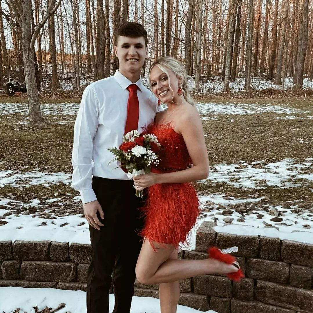 This red homecoming dress features a strapless neckline, a sheath silhouette with beaded detail and full of intricate feathers.