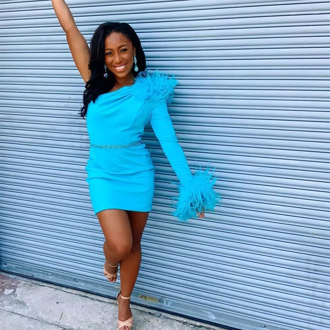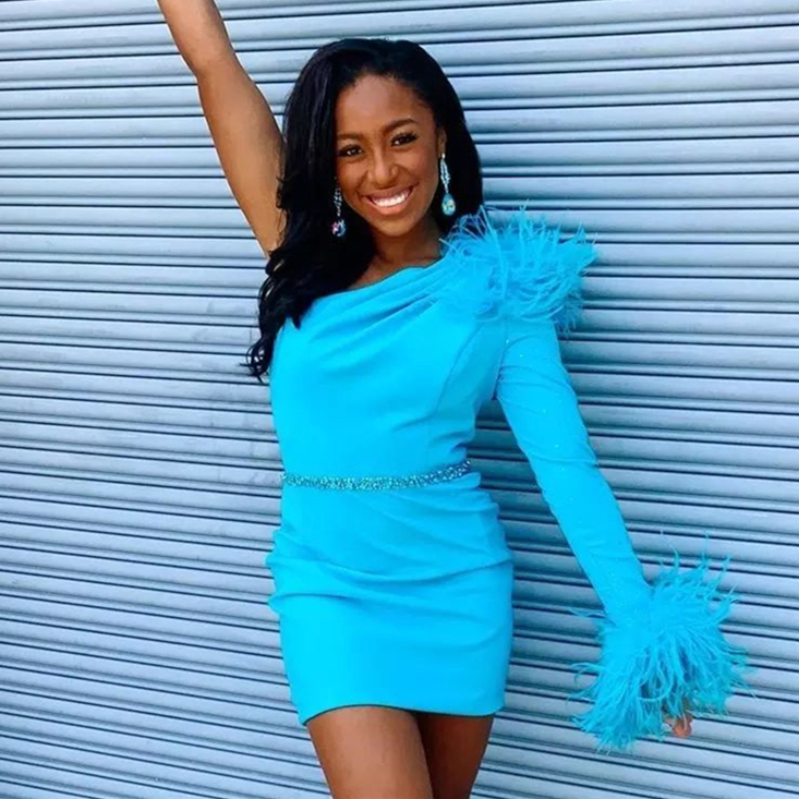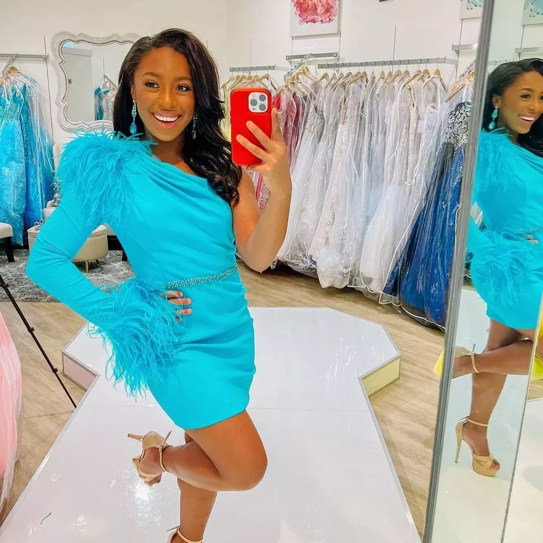 This blue homecoming dress features a feathered one shoulder neckline with a long sleeve edging feathers on the cuff, beaded detail at the waist, and the sheath silhouette will enhance the figure very well.