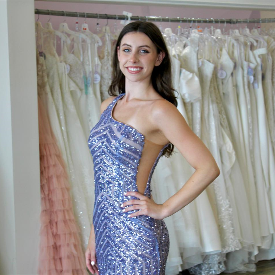 This lavender homecoming dress features a one-shoulder neckline, and a sheath silhouette full of sequined design.