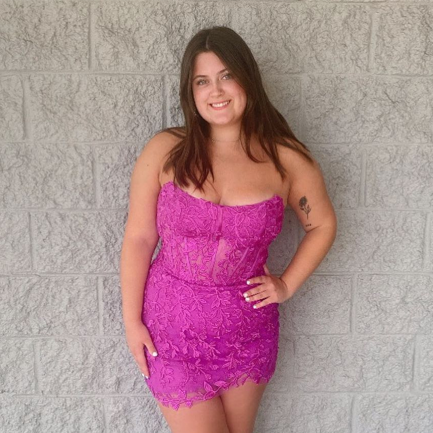 This fuchsia homecoming dress features a strapless neckline, and a sheath silhouette full of embroidered appliques.